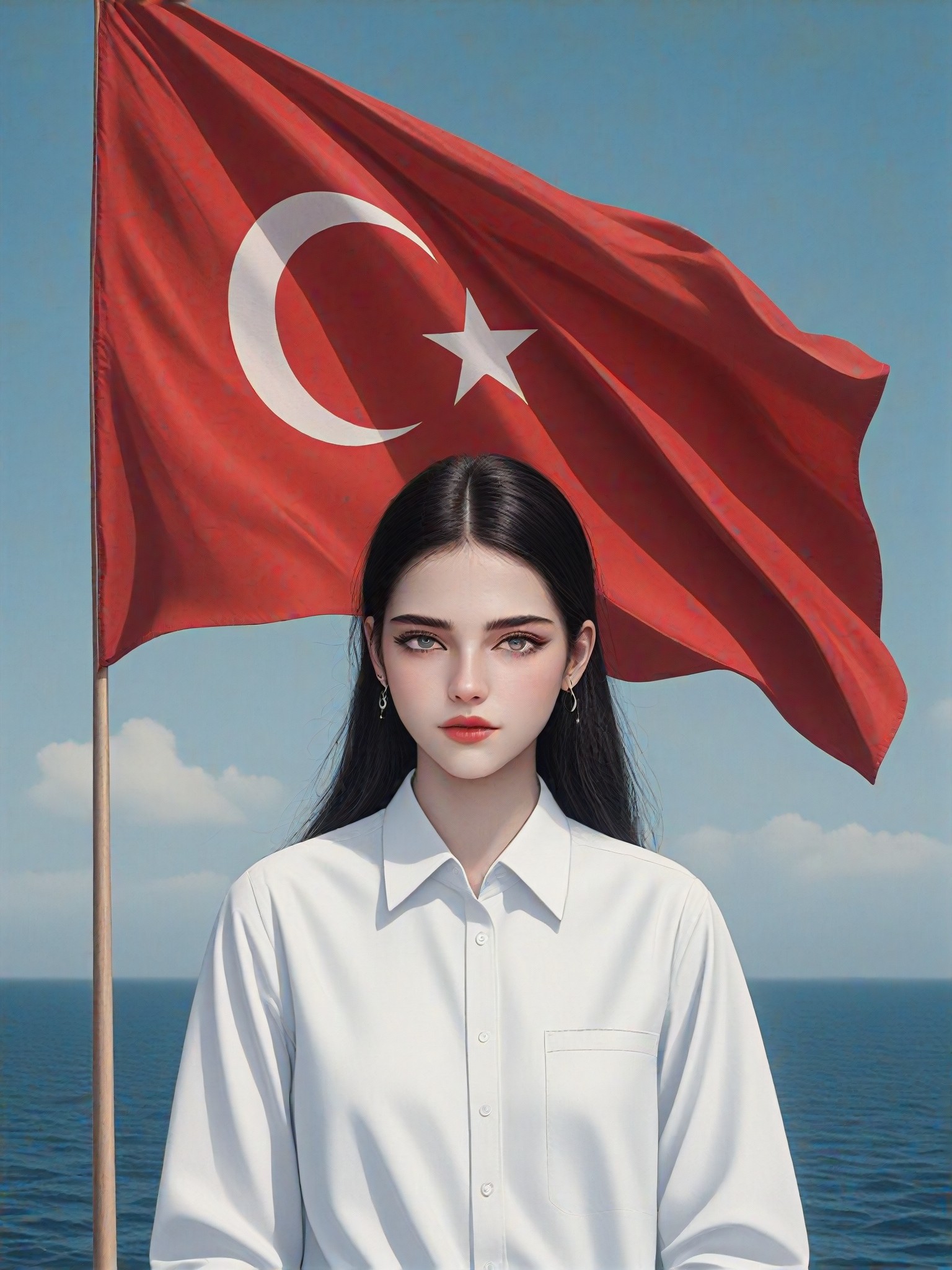 شخص، نصفه العلوي، يرتدي قميصًا أبيض، واقفًا ومبتسمًا، علم عثماني ضخم يرفرف خلف الشكل، بأسلوب رسم رقمي أو توضيحي، في CG 1.0، CG 2.0، ماستر، أو رسم رقمي، مع تصنيفات الرسوم المتحركة والميزات المميزة.