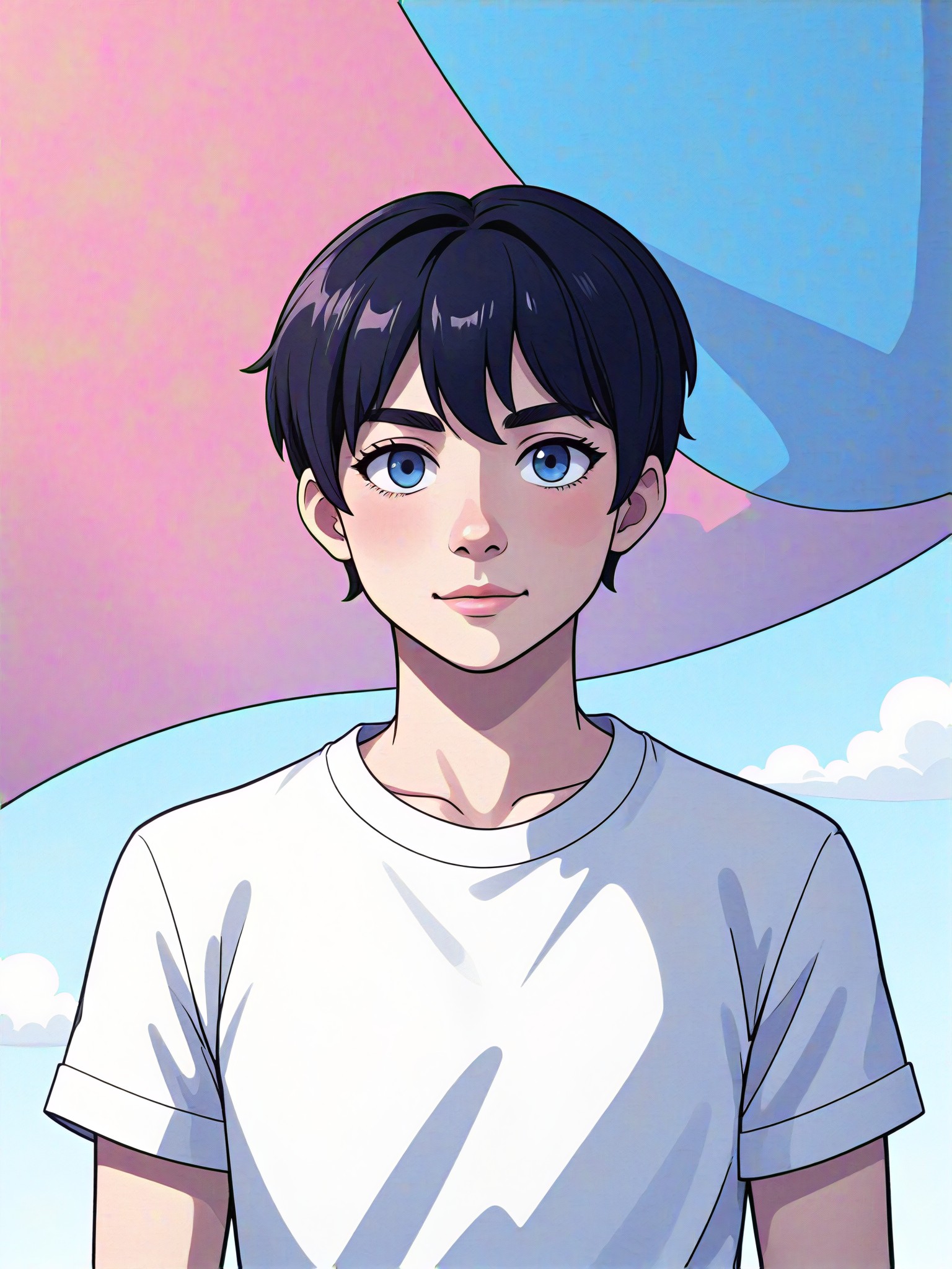 شخص، نصفه العلوي، يرتدي قميصًا أبيض، واقفًا ومبتسمًا، علم كبير باللونين الوردي والأزرق يرفرف خلف الشكل.