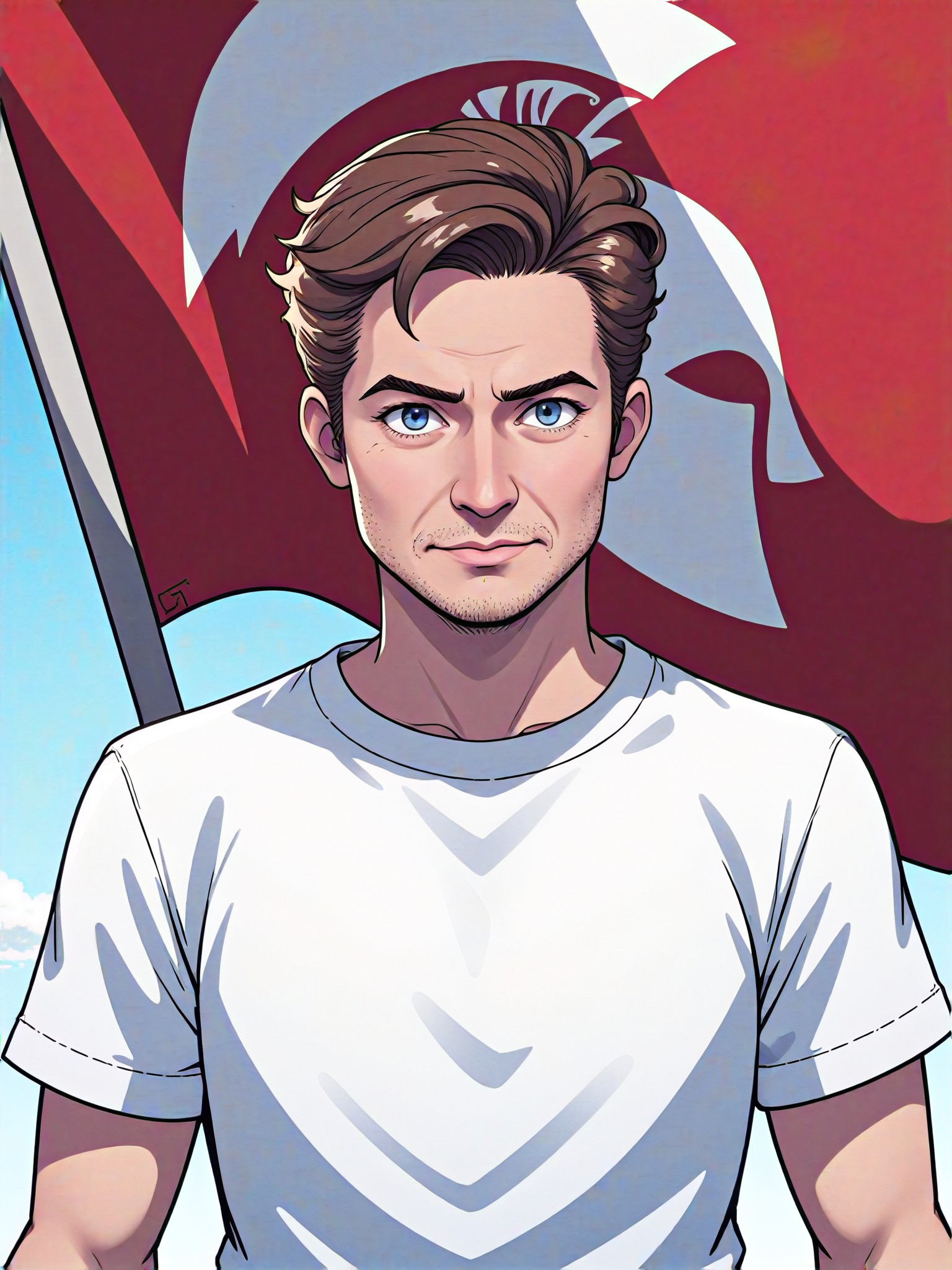 محوّل النمط يضيف علم سبارتي ضخمًا يرفرف خلف شخص يرتدي قميصًا أبيض، واقفًا ويبتسم.