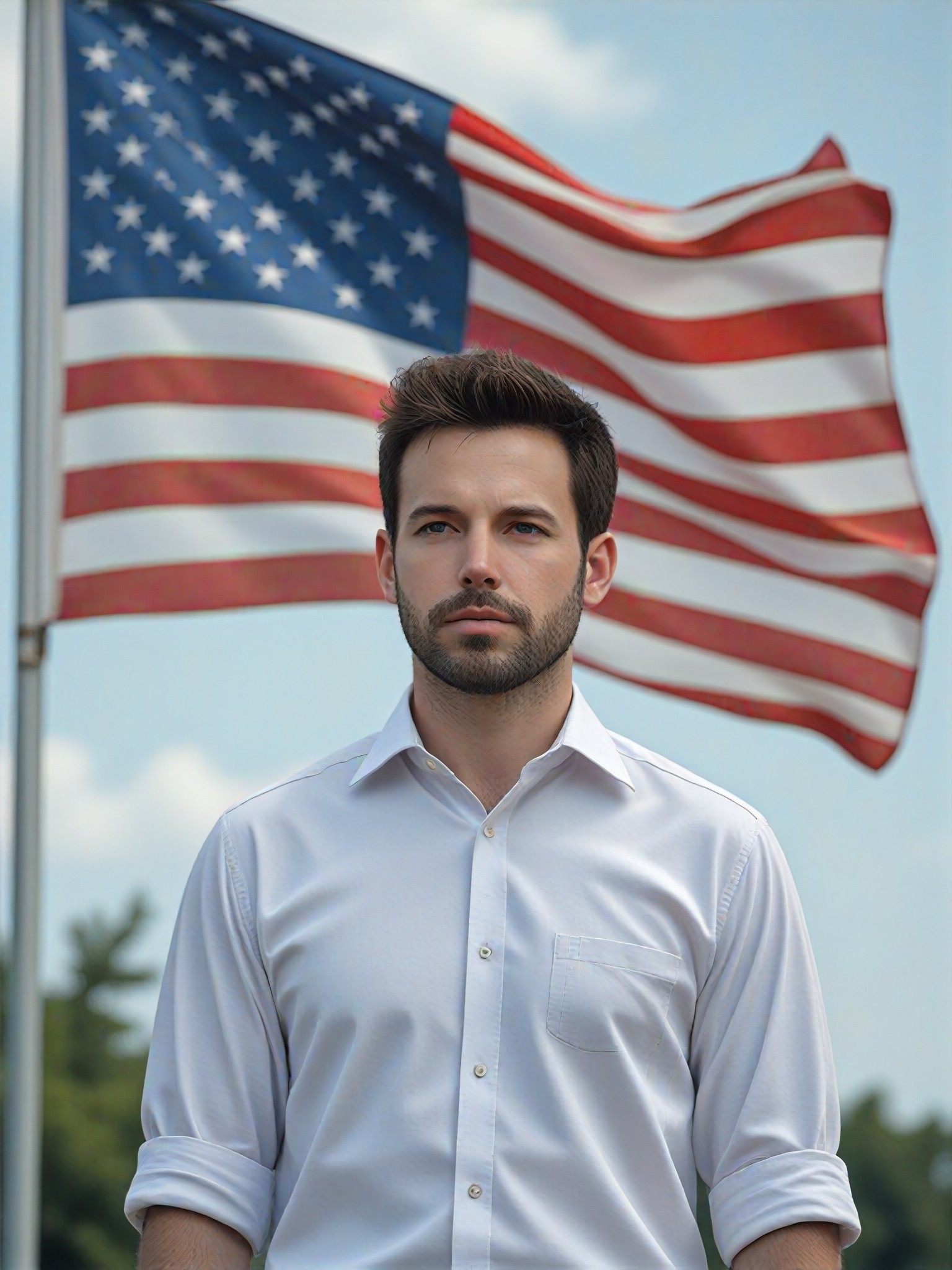 This style converter adds a huge Pledge Allegiance to the flag behind a person wearing a white shirt and smiling. The output format includes Master, CG 2.0, CG 1.0, Featured, Animation, Illustration, and Digital Painting.