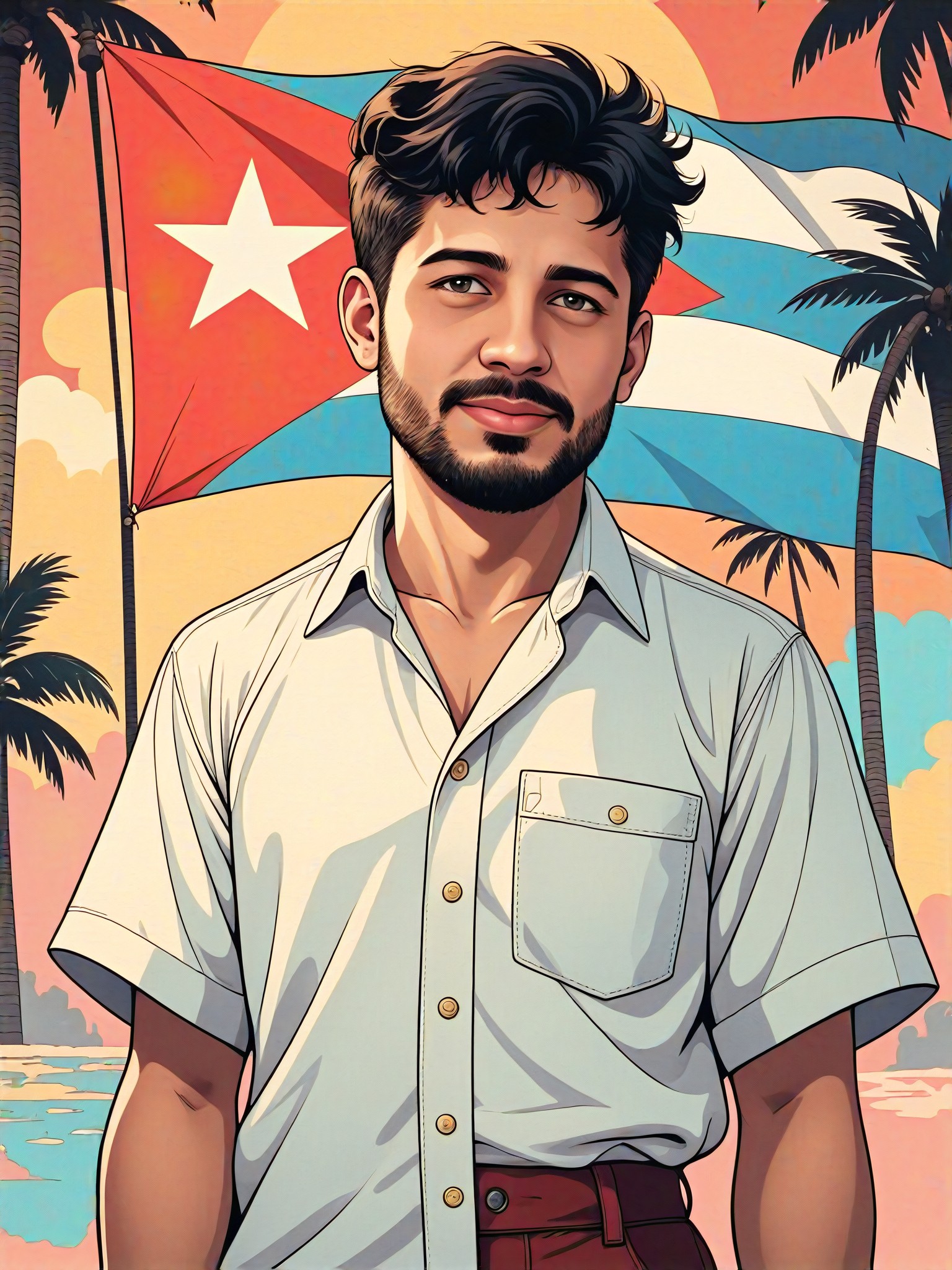This style converter adds a huge Puerto Rico vs Cuban flag to the background of a photo. The illustration features a person wearing a white shirt and standing with a smile. The output format is an animation of CG 2.0, featuring digital painting and master, CG 1.0. The style tag is not yet available for this converter.
