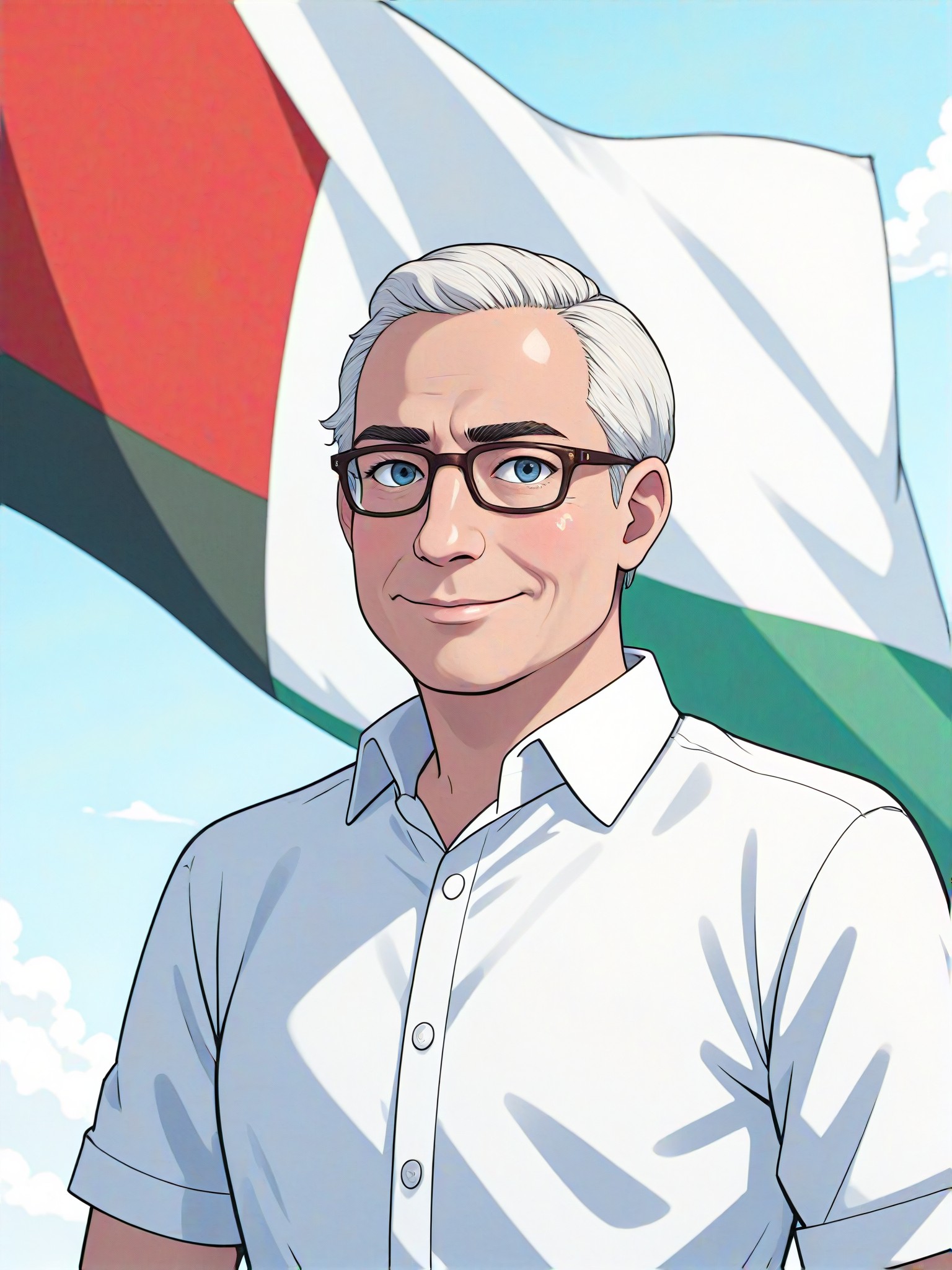 A person wearing a white shirt with a huge Hamas flag flying behind them.