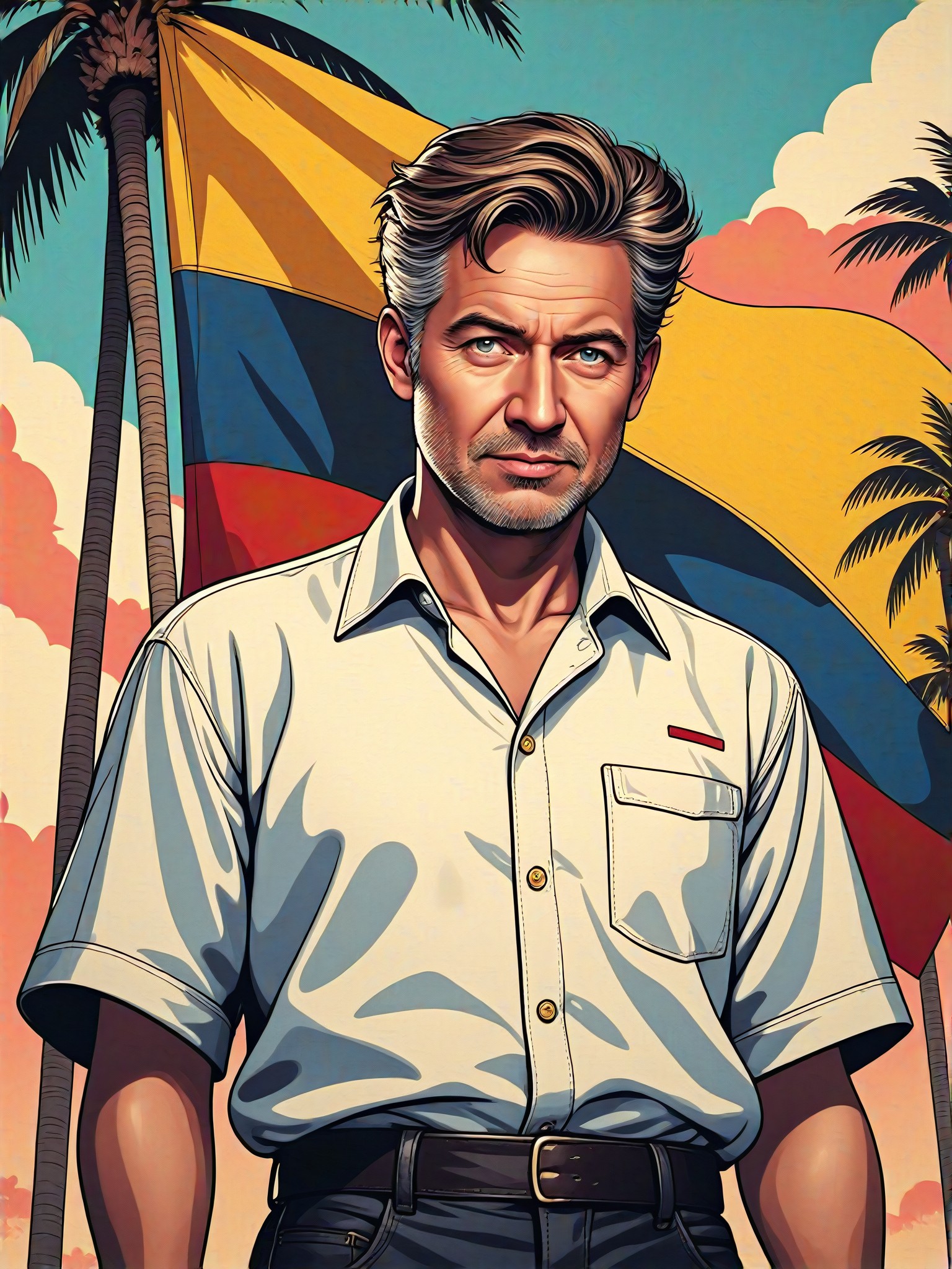 شخص يرتدي قميصًا أبيض، واقفًا ومبتسمًا، مع علم كولومبيا ضخم يرفرف خلفه.