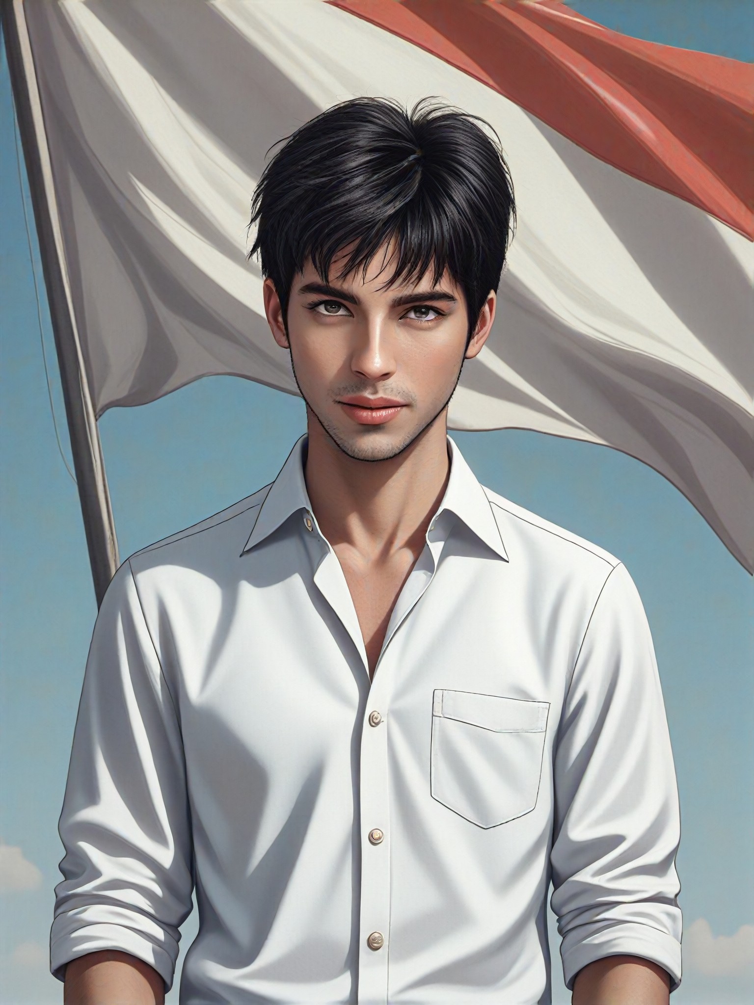 حوّل صورك إلى لوحات رقمية ورسوم متحركة وصور حاسوبية باستخدام محول نمط علم تشاد. احصل على شخص، نصفه العلوي، يرتدي قميصًا أبيض، واقفًا ومبتسمًا، مع علم تشاد الكبير الذي يرفرف خلفه.