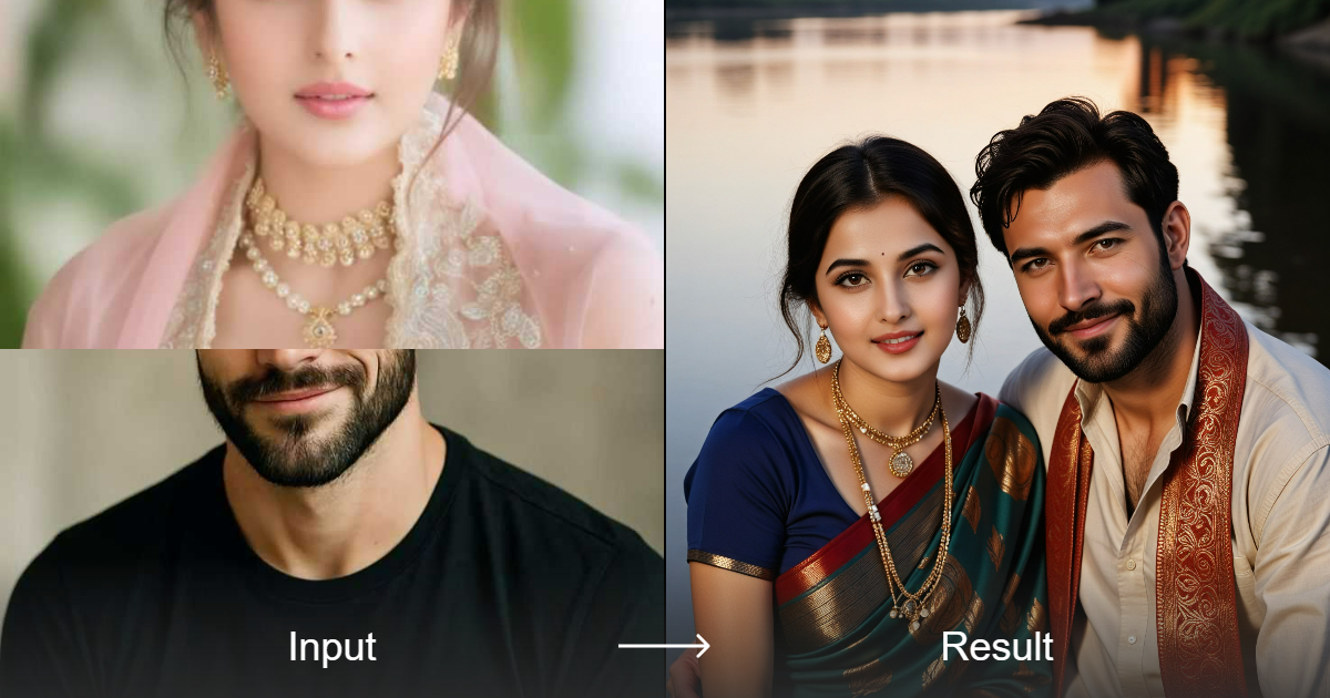 Create stunning couple photos in traditional Indian attire, set against a serene river backdrop, all in high-definition art style.