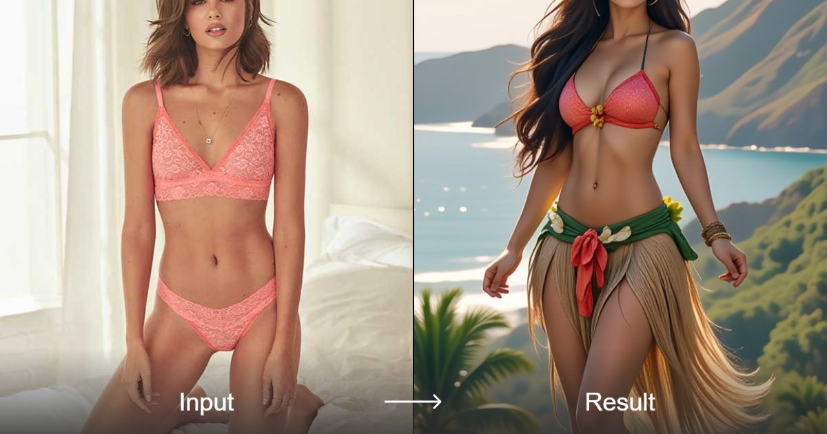 قم بتحويل صورك إلى ملابس بيكيني وتنانير عشب واقعية باستخدام مُنشئ الفن الاحترافي الخاص بنا المزود بتقنية الذكاء الاصطناعي المتقدمة، والمتوفر بـ 9 أنماط مختلفة.