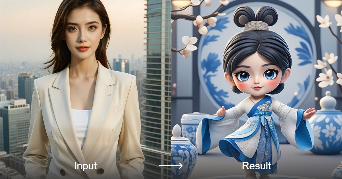 A1. محول نمط الفن: سيدة الفخار الأزرق والأبيض ثلاثية الأبعاد | a1.art