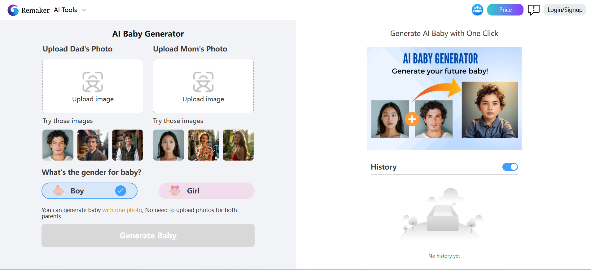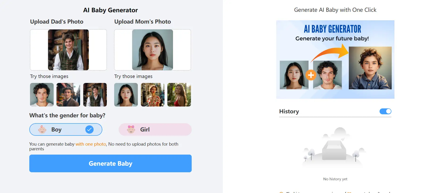 Instant results: After you upload the father's photo and mother's photo and select the baby's gender, you will immediately see two realistic photos. Unlike the previous two baby face generators, you do not need to wait for an email.