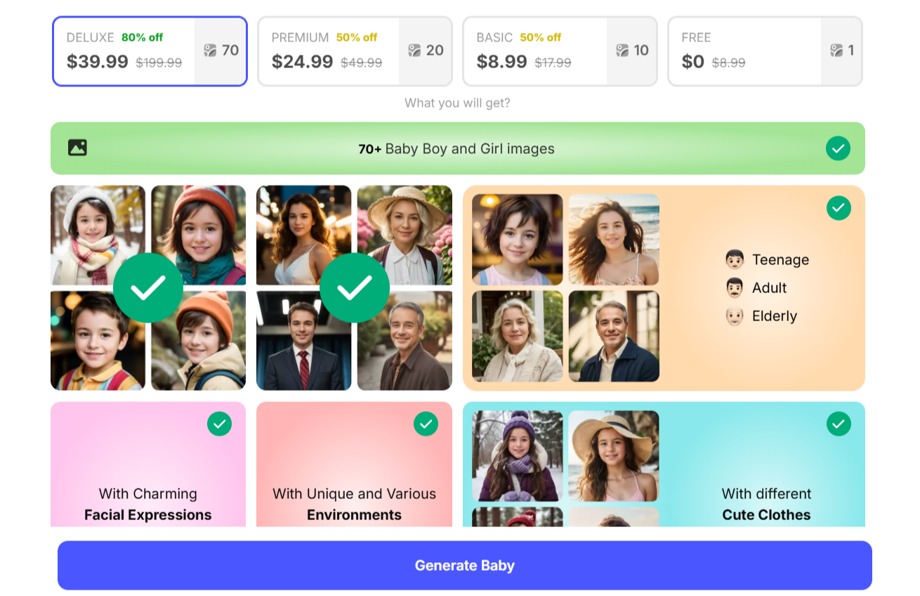 Photos in 4 different stages: If you order a deluxe plan, you can see the photos of your potential baby in her/his infant, teenage, adult, and elderly stages.