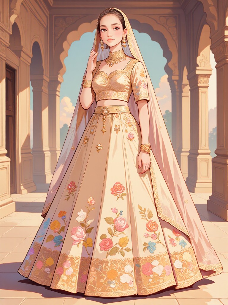 Experience the enchanting fusion of Sabyasachi Mukherjee's iconic Kanauj Rose Lehenga in a captivating anime-style animation. Bring your traditional Indian attire to life in soft, vibrant colors and intricate detailing.