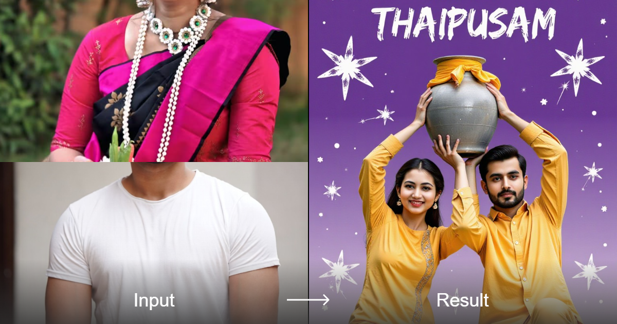 Create stunning Thaipusam-themed couple photos with our advanced AI art style converter, featuring traditional attire, vibrant colors, and intricate details.
