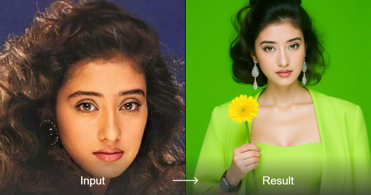 Verwandeln Sie Ihre Ideen mit unserem Sexy-Gal-Remix-Stilwandler in atemberaubende Porträts – dargestellt wird eine lebendige, stilvolle und elegante Frau in einem schicken, limegrünen Outfit, die eine leuchtend gelbe Blume hält.