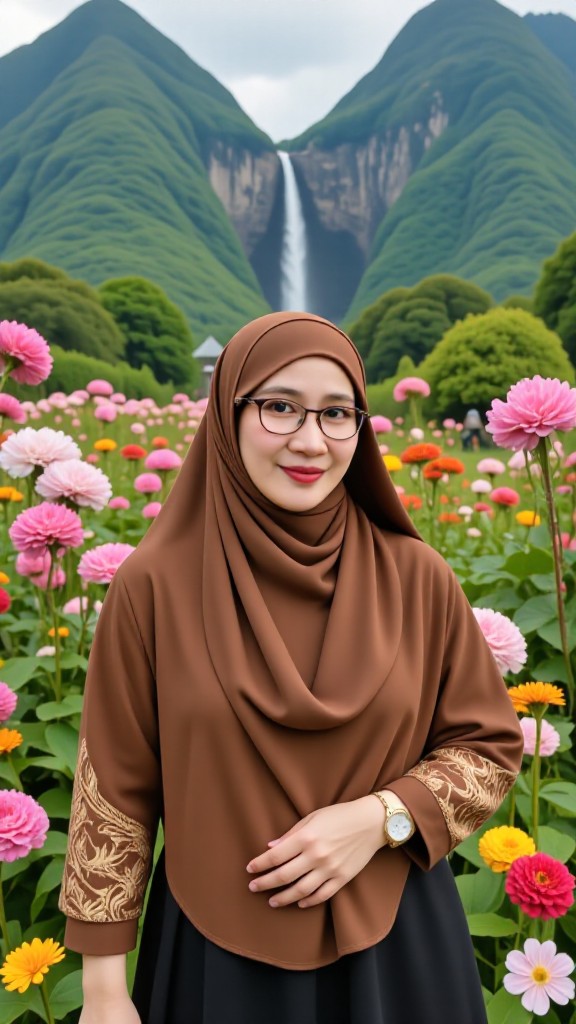 Erzeuge ultrarealistische, filmreife Porträts von 60-jährigen indonesischen Muslimfrauen mit eleganten Details und lebendigen Hintergründen.