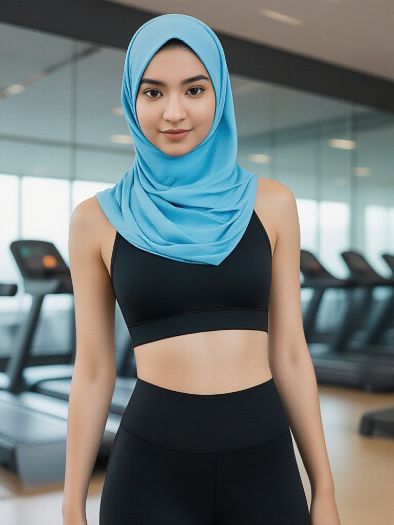 Erstellen Sie eindrucksvolle Bilder selbstbewusster, verschleierter Frauen in modernen Fitnessstudios, die Bescheidenheit mit modernen Fitness-Trends verbinden.