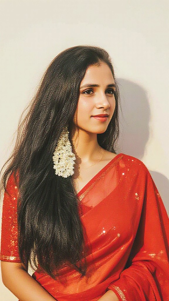 Verwandeln Sie Ihre Fotos mit unserem KI-gestützten Stilwandler in atemberaubende Bilder im roten Party-Saree-Look – perfekt, um jedem Foto eine Prise Eleganz zu verleihen!