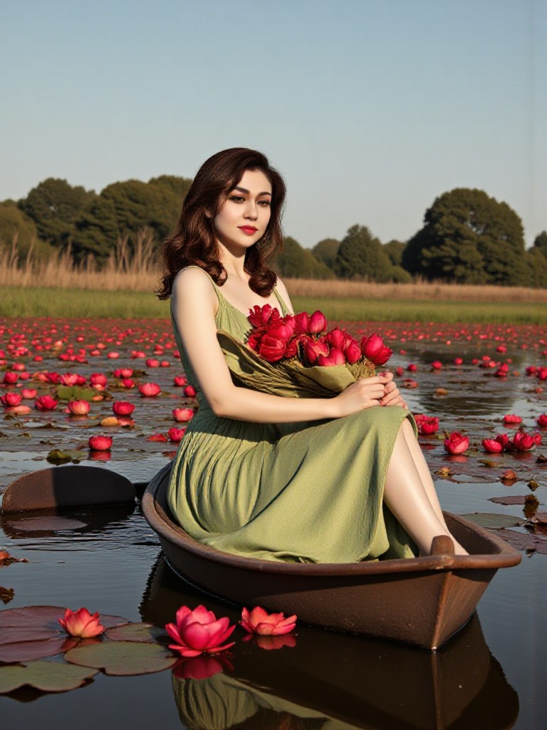 Erstellen Sie atemberaubende, fotorealistische Bilder einer friedvollen Szene, in der eine Frau in einem Boot auf einem stillen Sumpfgebiet mitten zwischen blühenden Seerosen sitzt.