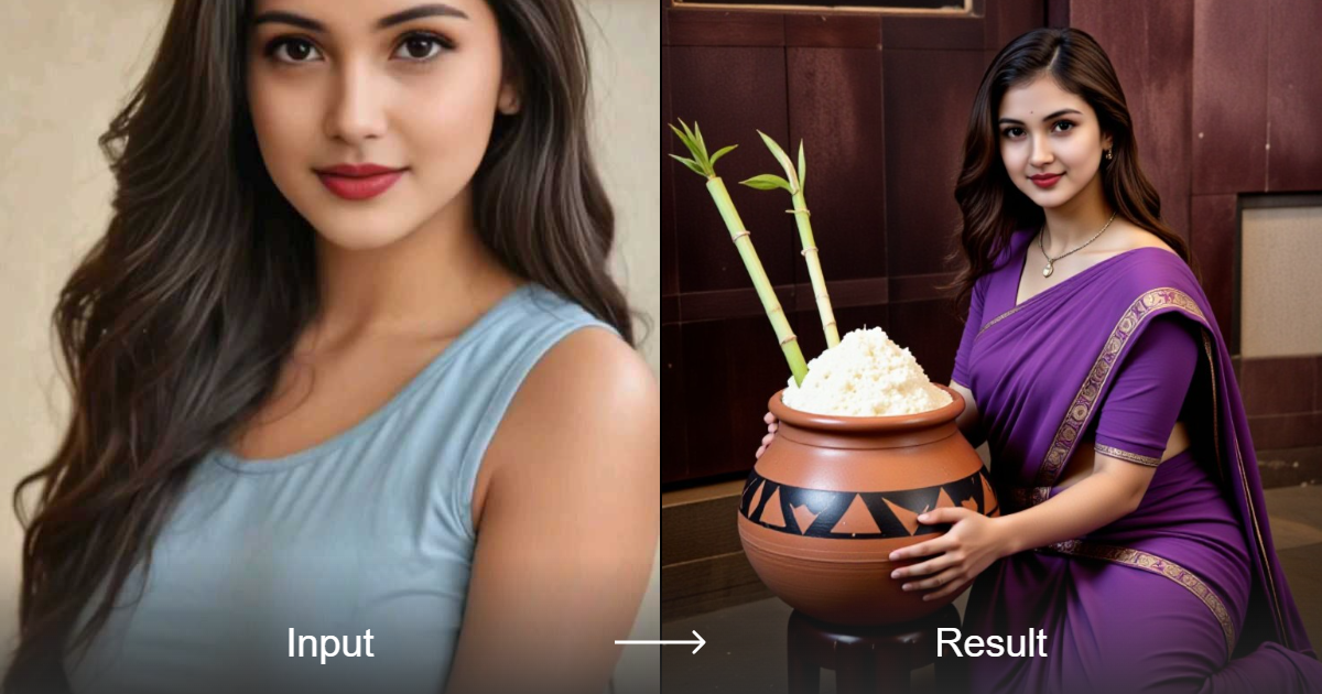 Transform your photos into stunning art with our My Pongal Photoshoot style converter, featuring character realism, vibrant colors, and unique cultural details.