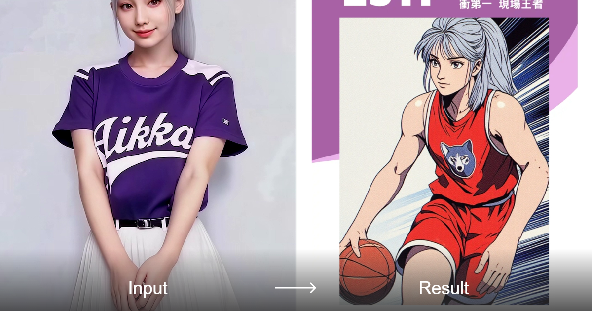 Transform your images into a cyberpunk anime style inspired by the classic basketball manga, perfect for showcasing innovative business ideas.