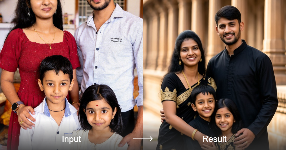 Transform your family photos into beautiful, cinematic Indian family art with our AI filter. Generate realistic, cartoon, and 3D styles effortlessly.
