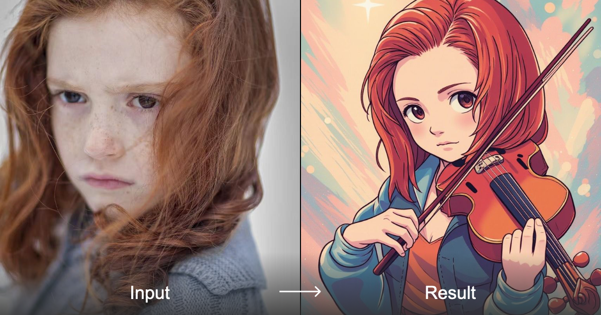Genere imágenes en estilo anime de una persona tocando el violín con la ayuda del Convertidor de Estilo de A1 Art. Obtenga resultados profesionales con solo unos pocos clics.