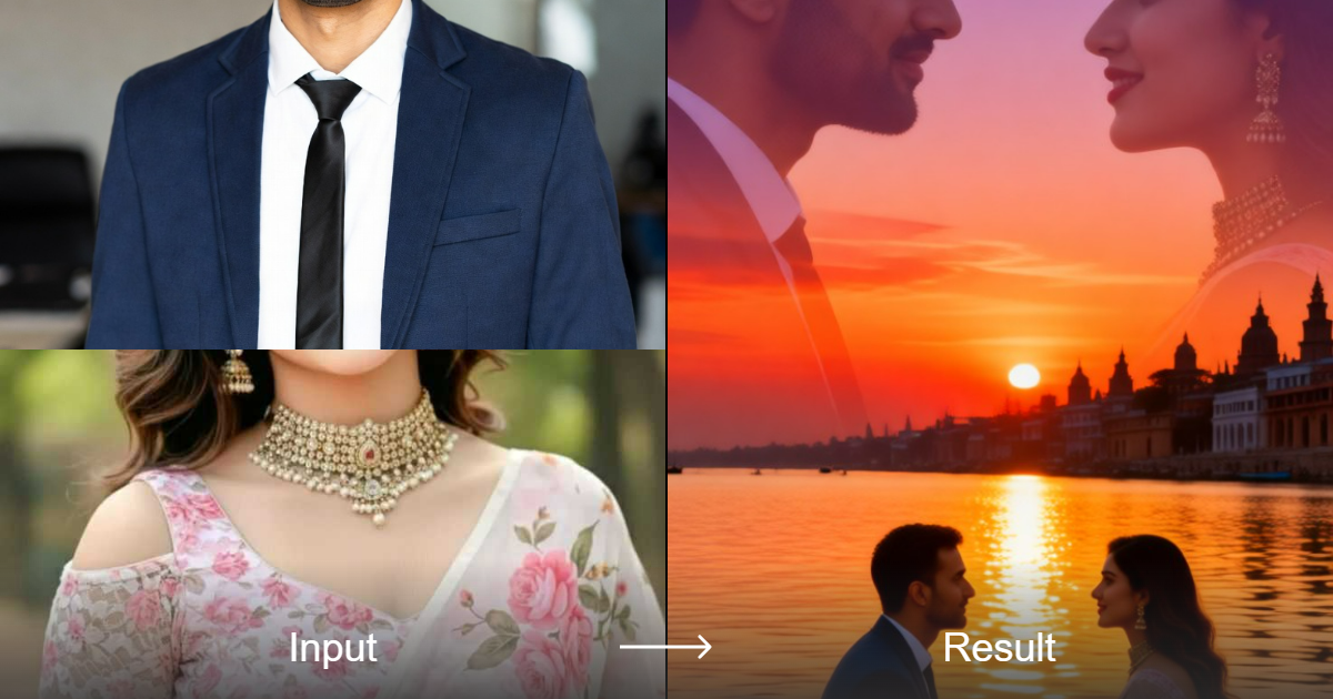 Transform your photos into stunning Ganges Sunset Glow double exposure art with this AI filter. Achieve cinematic, romantic visuals blending two images seamlessly.