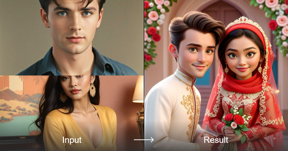 Generate adorable and fun cartoon Muslim wedding images with a 3D effect. Perfect for creating group photos and sharing on social media.