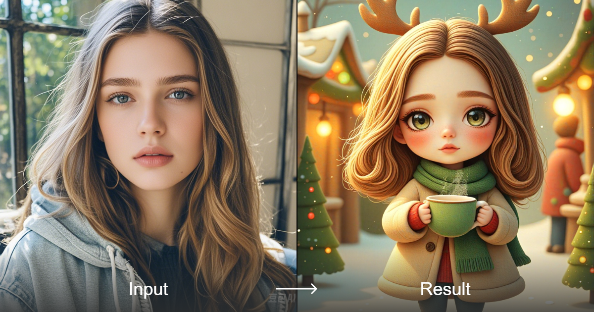 Experimenta la magia del arte de dibujos animados 3D con nuestro convertidor de estilo. Este convertidor de estilo revive la atmósfera festiva del mercado con su chibi vestido con un abrigo beige, una bufanda verde y cuernos de reno. La taza humeante que sostiene el chibi añade un toque de calidez a la escena, lo que la hace perfecta para la temporada festiva. Las luces de colores y los puestos del mercado realzan aún más la sensación festiva de la imagen. Con el formato de salida de ejemplo, puedes incorporar fácilmente este estilo a tus propios proyectos.