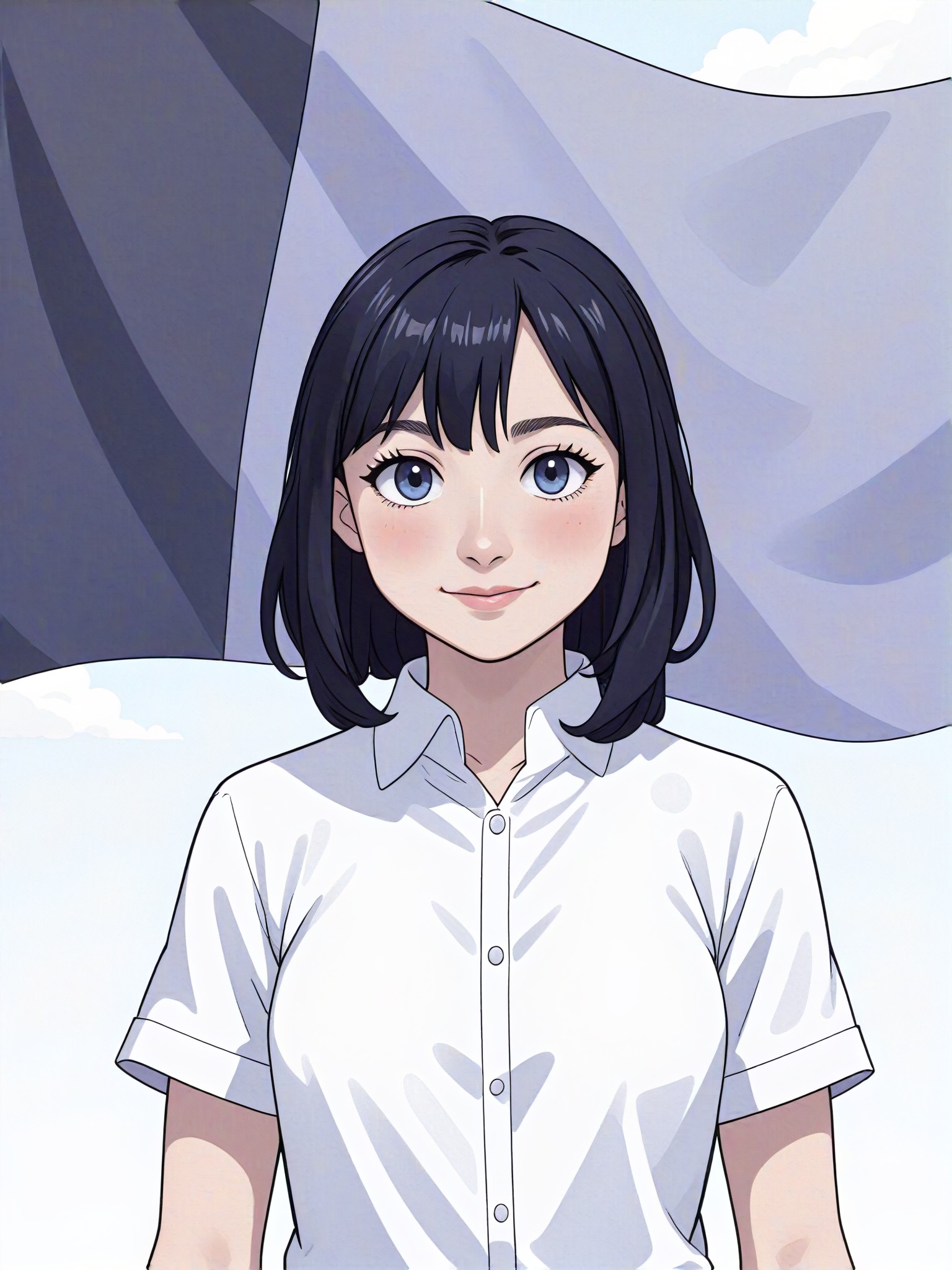 Una persona con la parte superior del cuerpo vistiendo una camisa blanca, está de pie y sonriendo. Una enorme bandera negra, gris, blanca y morada está ondeando detrás de la figura, en un estilo de pintura digital, ilustración, animación o CG 1.0, CG 2.0.