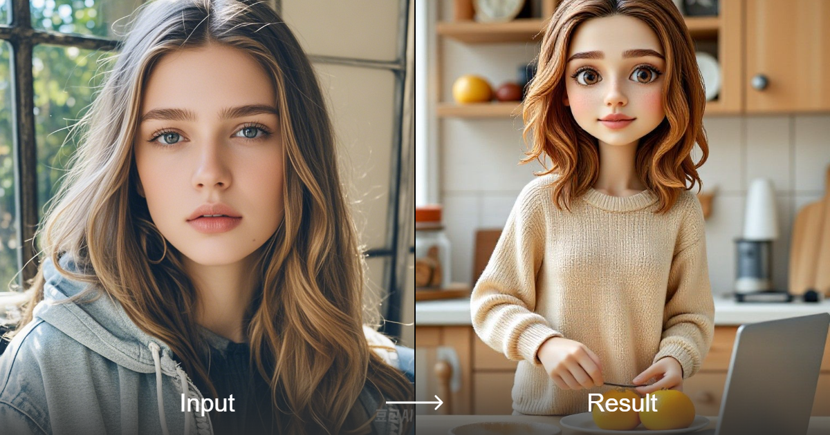 Genera imágenes tiernas, profesionales, de juguete y en 3D de una persona de 30 años preparando el desayuno en la cocina. El convertidor de estilo también incluye un fondo con una laptop reproduciendo noticias.