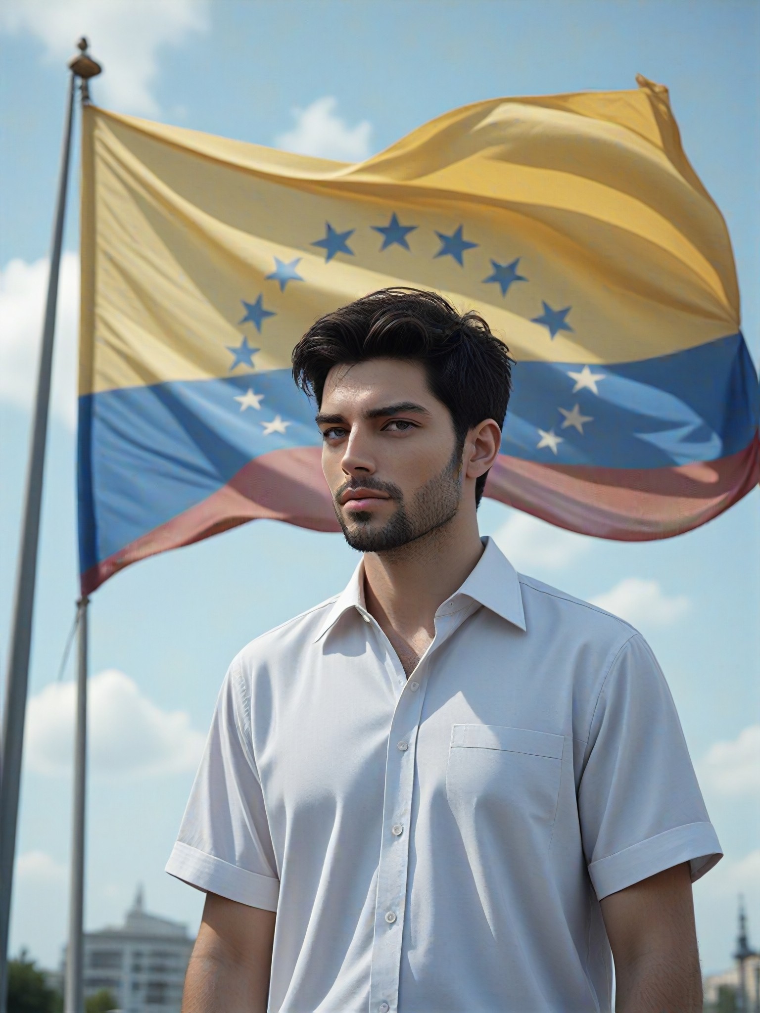 Una persona viste una camisa blanca con una gran bandera de Venezuela ondeando detrás de ellos.