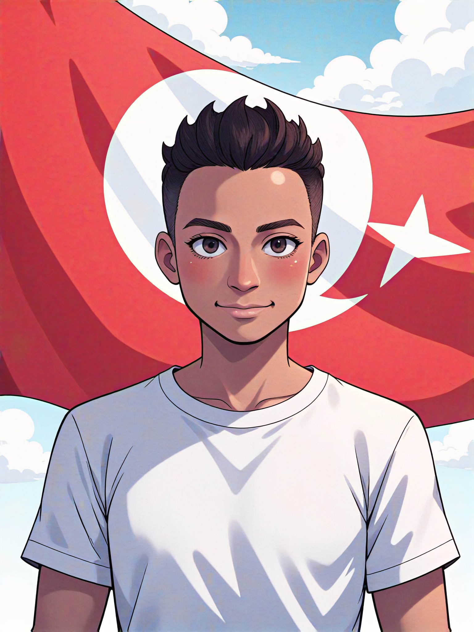 Mejora cualquier imagen con un fondo de la bandera turca, utilizando los estilos Master, CG 1.0, CG 2.0 o cualquier otro formato preferido. Obtén una ilustración, pintura digital o animación con una persona que lleva una camisa blanca y una gran bandera detrás.