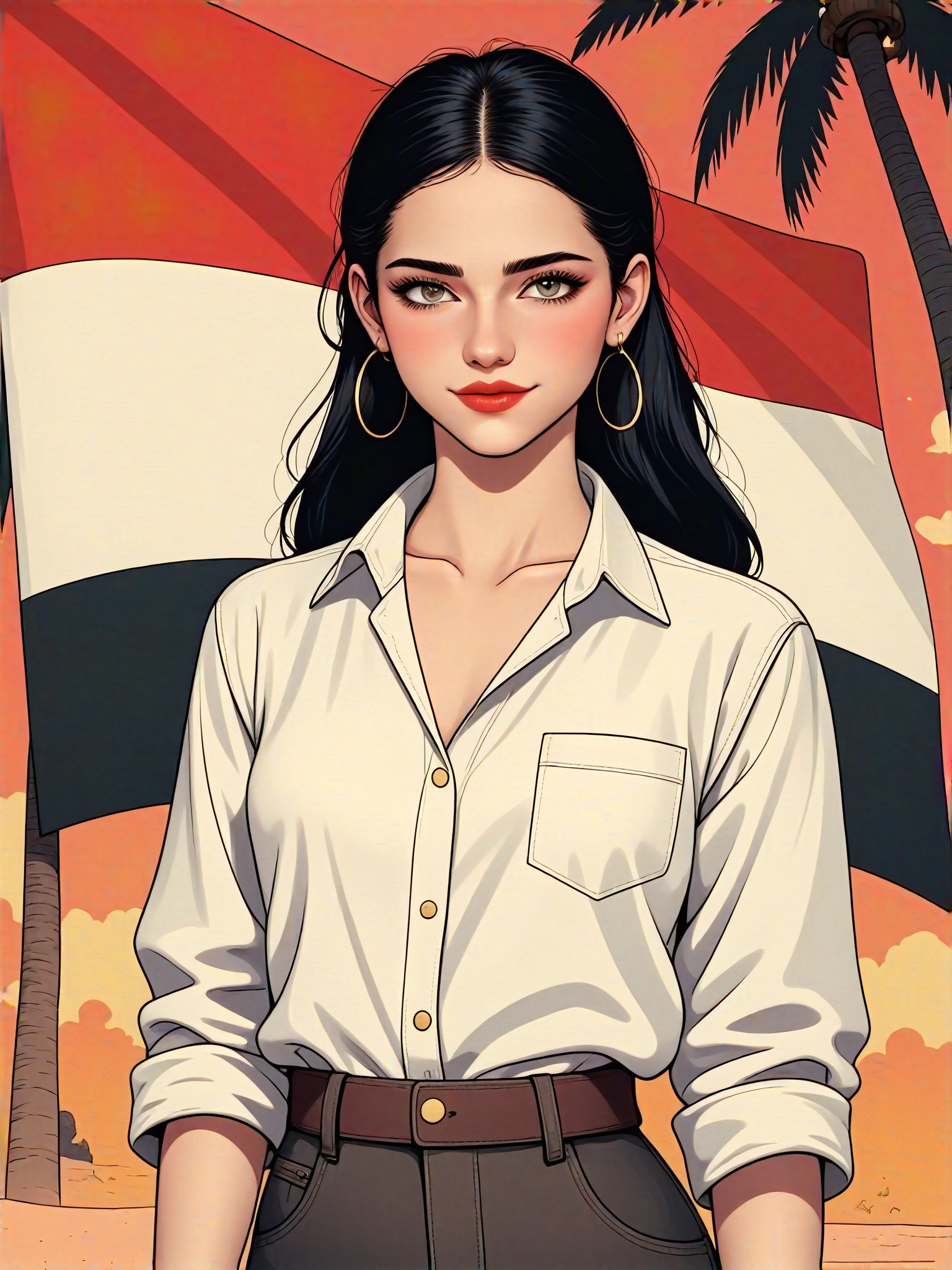 Una persona vestida con una camisa blanca, de pie y sonriendo con una enorme bandera de Egipto detrás. Perfecto para cualquier proyecto que busque agregar un toque de estilo internacional.