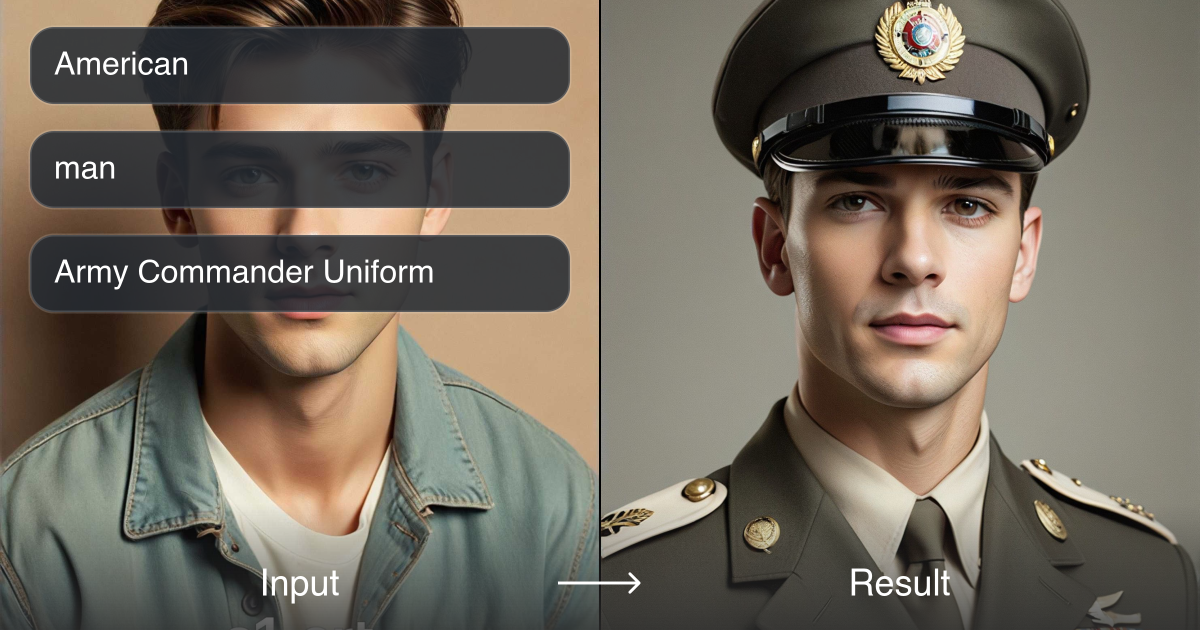 Convierte fácilmente tu foto en un impresionante uniforme militar con a1.art. Experimenta una nueva apariencia con solo unos clics.