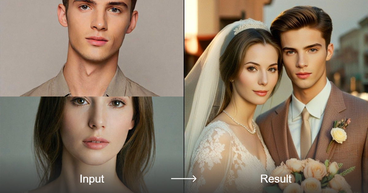 The Wedding Photos style converter generates professional and realistic group photos using a combination of portrait and professional photography techniques.