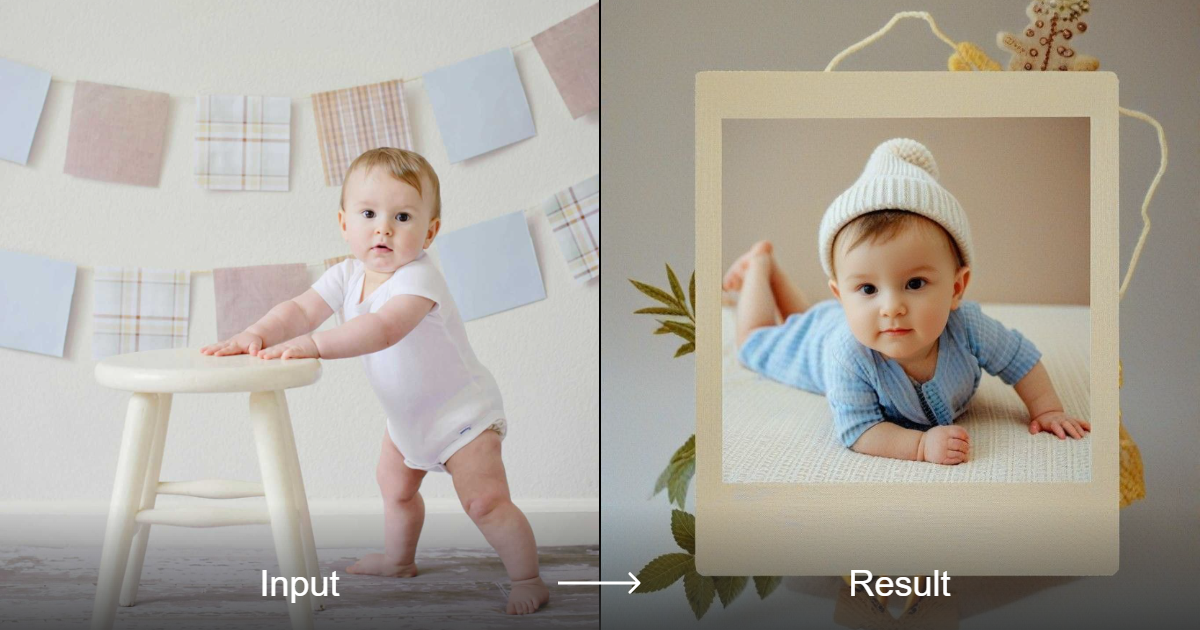 A professional photo style converter that generates real-life photographs of newborn babies crawling on polaroid photos. The output format is a photography-style document with a realistic and professional appearance.