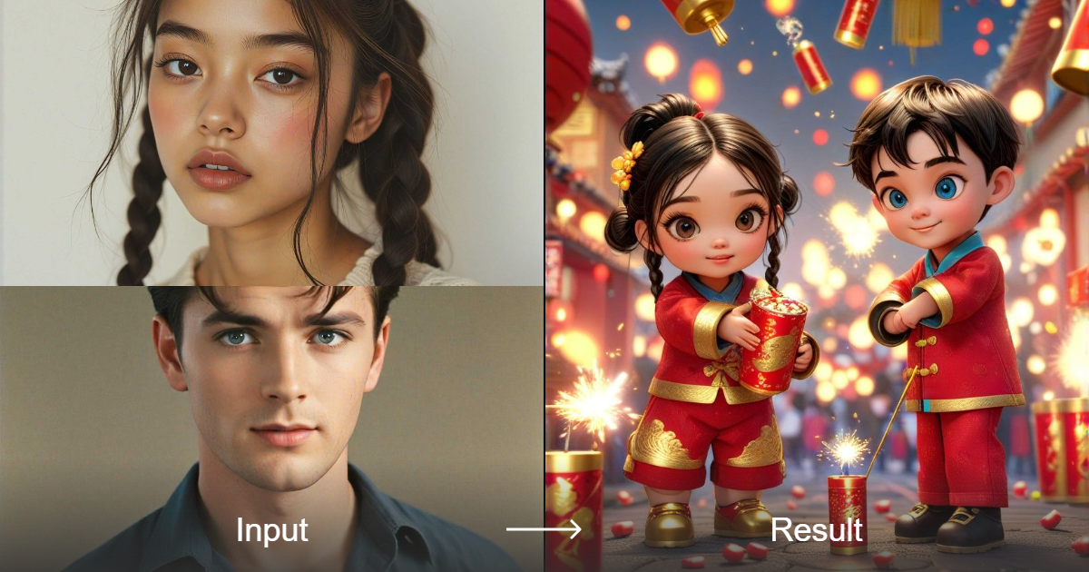 A 3D, Cute Style Converter that generates group photos, 3D images, and chibi-style images of two kids holding firecrackers, surrounded by firecracker shavings. Perfect for Chinese New Year and Disney theme.