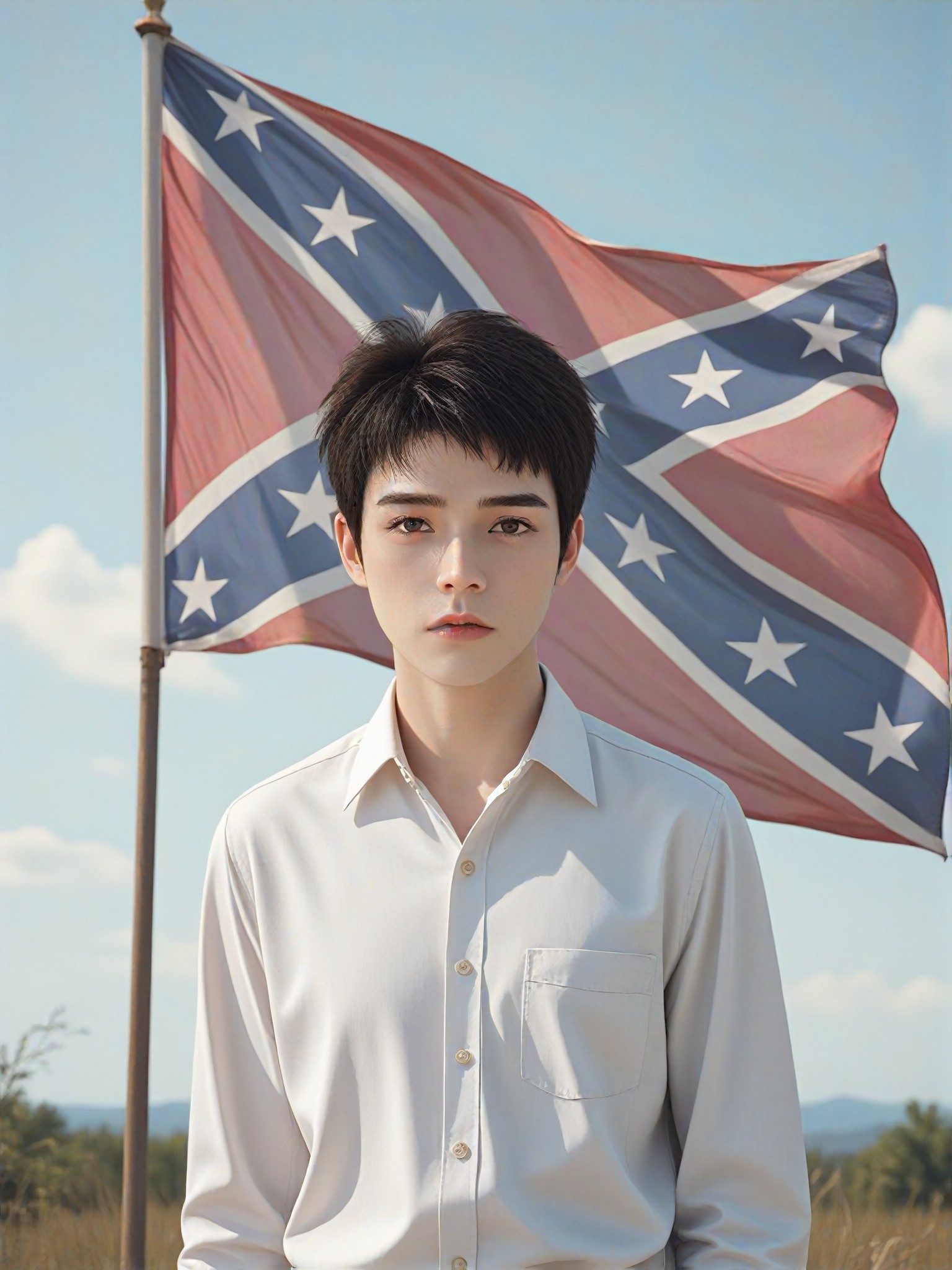 The Style Converter adds a huge original Confederate flag to the back of a person wearing a white shirt, creating a unique and striking image.