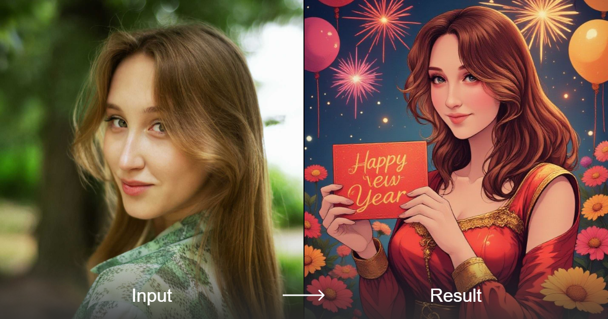 Photographed in A1.artA young man stood in a colorful and festive flower sea, smiling, happy, joyful, with the center shining brightly, and the background adorned with brilliant fireworks and balloons. She held a red patterned greeting card with the sign "Happy New Year" in her hand, dressed in festive attire,