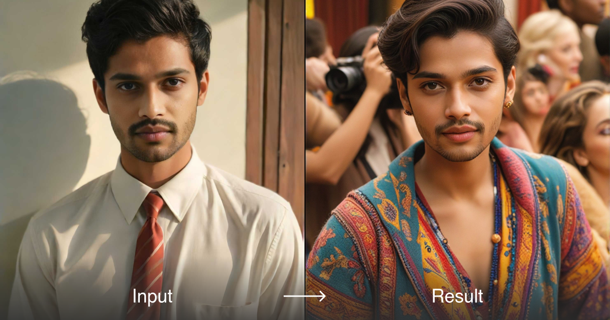 Easily convert your modern attire to a vibrant, traditional look with A1 Art. One-click transformation.