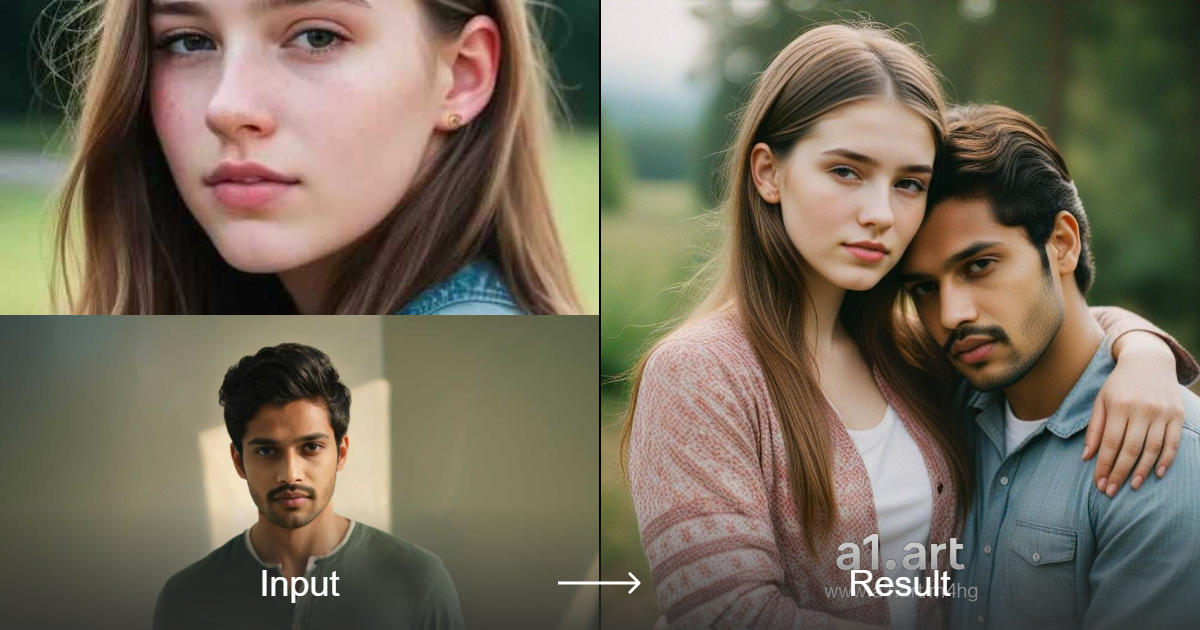 Hasilkan foto grup yang realistis, potret profesional, dan gambar emosional dengan close-up pasangan yang saling peluk.