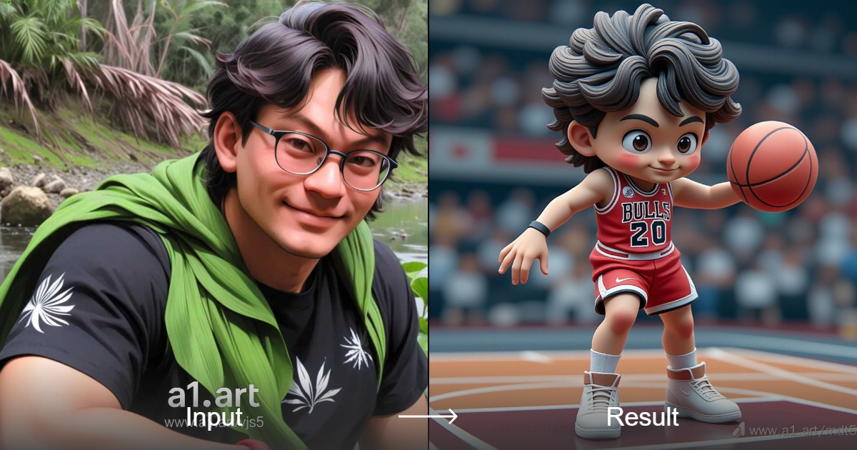 Konverter gaya Master 3D untuk menghasilkan gambar boneka basket dengan keluaran 100% unik setiap kali.
