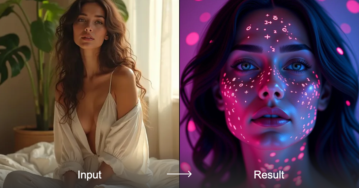 Rasakan dunia futuristik Shadowrun Math Projection dengan close-up wajah seseorang (Jessica Szohr) yang disetting dalam latar belakang lingkungan logis, Cinestill, persamaan holografik DayGlo merah muda dan hitam diproyeksikan pada kulit mereka, titik krisis, hantu dan gaya Mesir/Rakyat, menciptakan suasana World of Warcraft dan simetri sempurna.