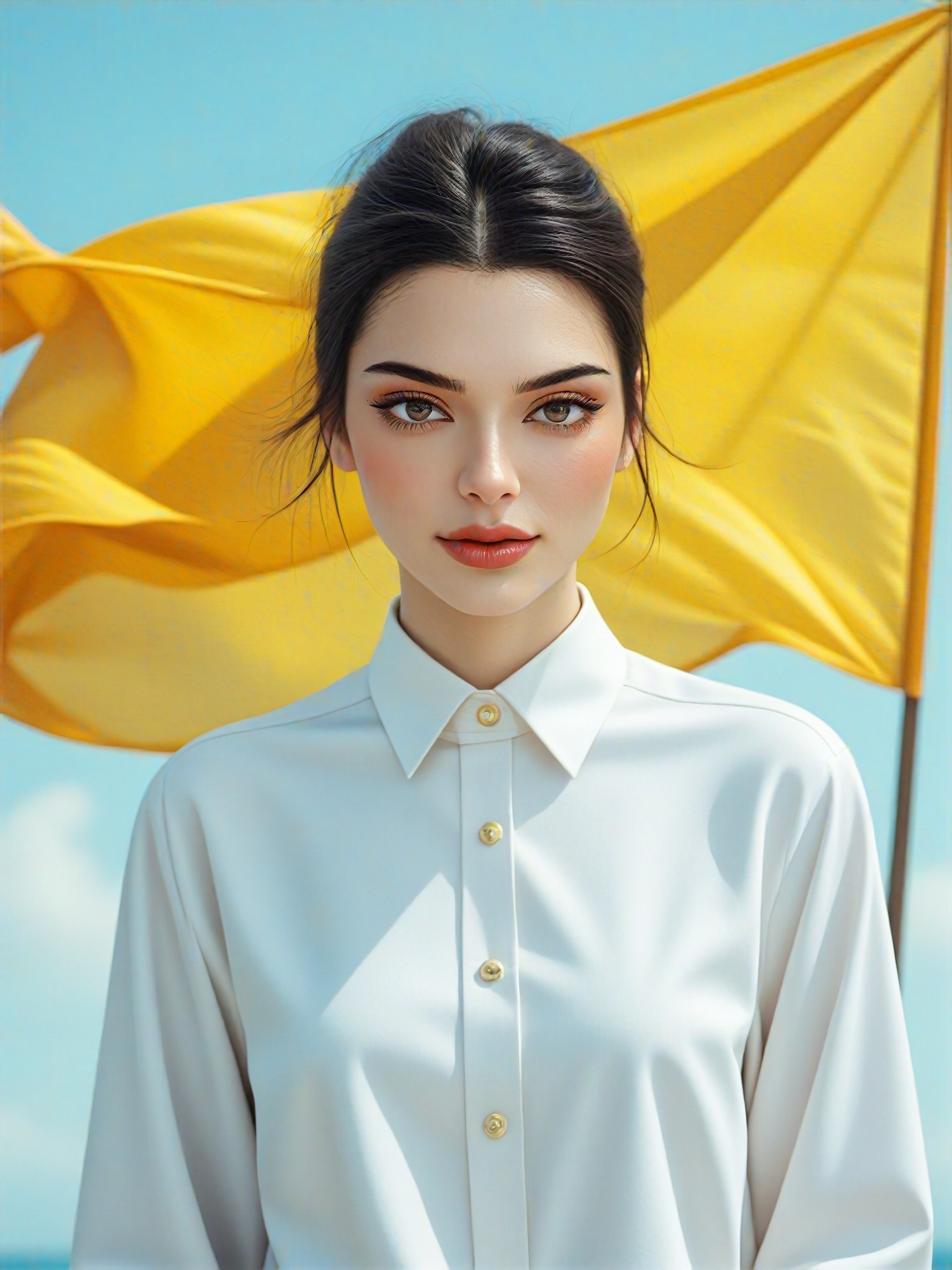 Seseorang bagian atas tubuh memakai kemeja putih, berdiri dan tersenyum, dengan bendera kuning biru besar berkibar di belakang sosok tersebut.