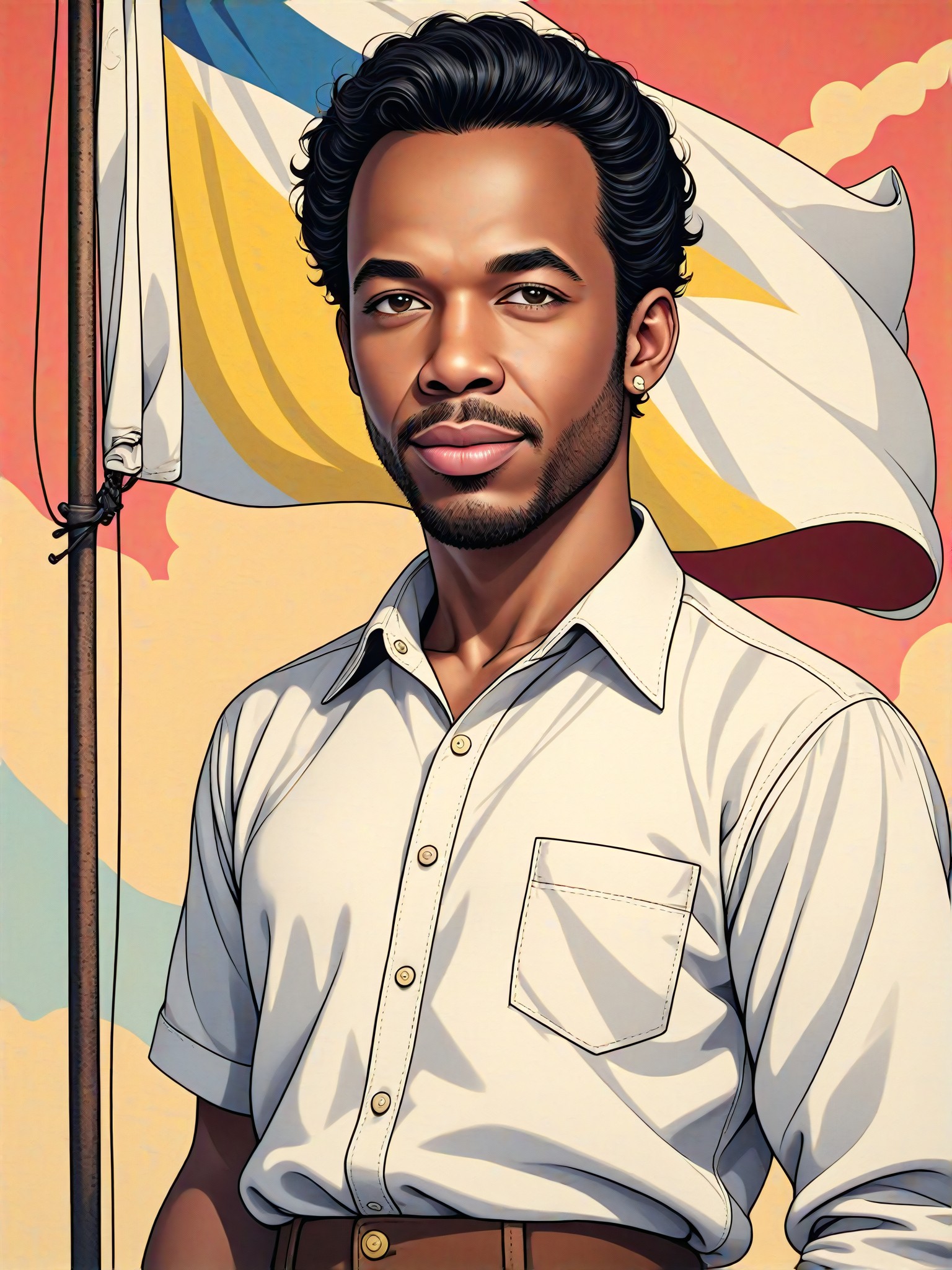 Seorang dengan bagian atas tubuh mengenakan kemeja putih, berdiri dan tersenyum, dengan bendera Komune Virginia yang besar berkibar di belakangnya.