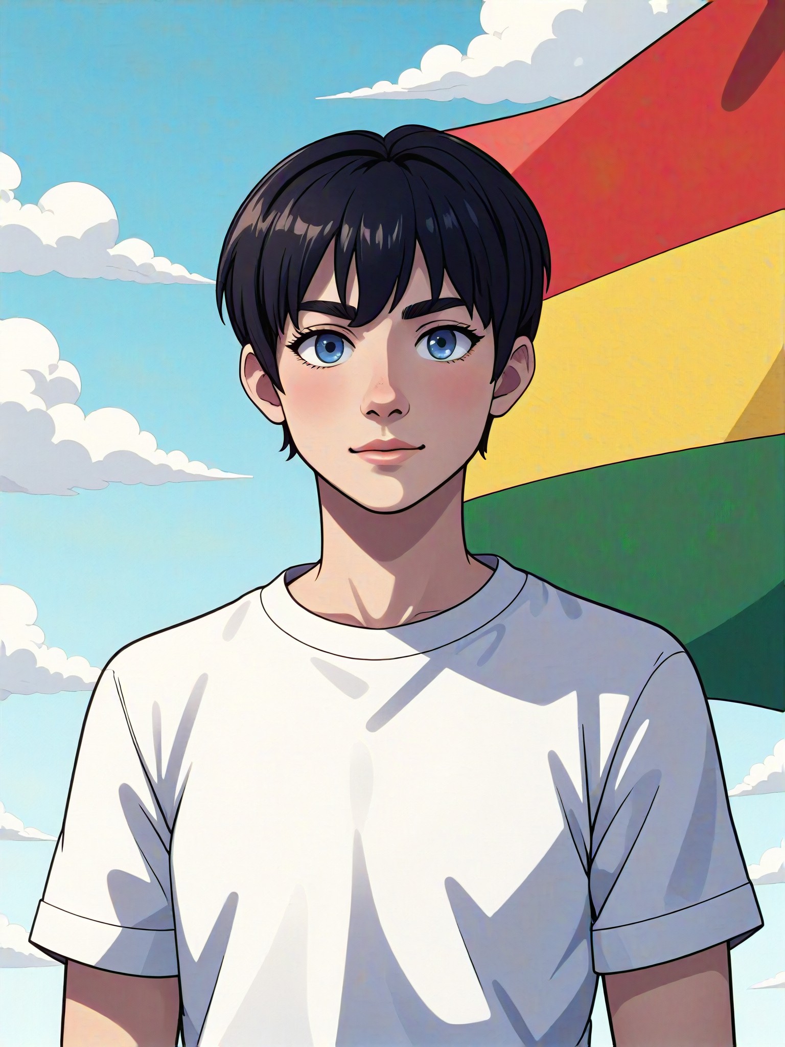 Tingkatkan foto Anda dengan animasi bendera Sudan Selatan, yang menampilkan lukisan digital, ilustrasi, dan gaya CG. Seseorang yang memakai kemeja putih tersenyum, dengan bendera berkibar di belakangnya.