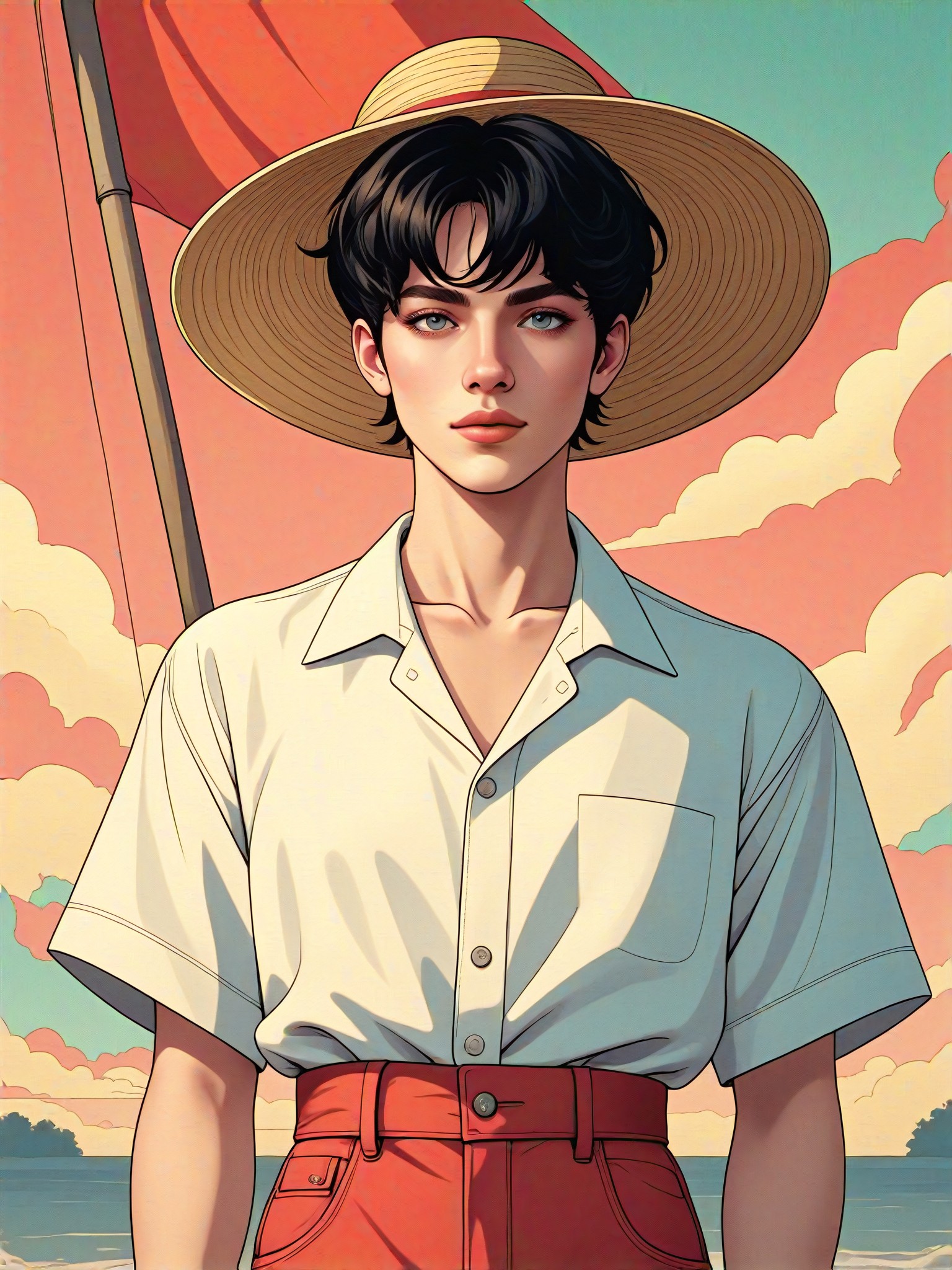 Ilustrasi orang yang mengenakan topi jerami, lukisan digital, animasi, atau CG 2.0. Sebuah bendera topi jerami besar berkibar di belakang figur, membuat foto tersebut unik dan menarik perhatian. Konverter gaya dapat digunakan untuk berbagai tujuan, seperti membuat poster, kartu ucapan, atau postingan media sosial. Ini adalah alat yang bagus untuk siapa saja yang ingin menambahkan sentuhan kepribadian dan kreativitas ke gambar mereka. Format output sangat serbaguna dan dapat digunakan untuk proyek digital maupun cetak.