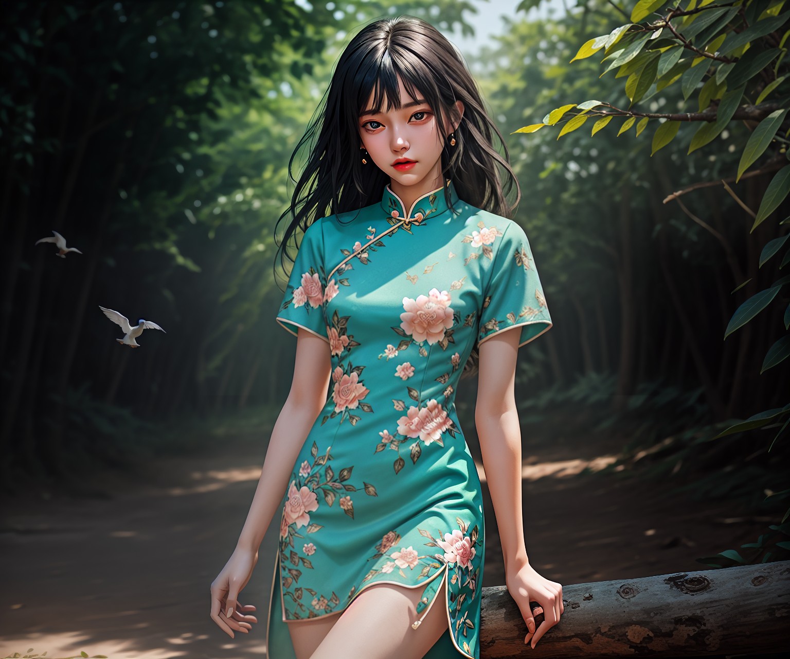 1girl, (グリーン short china dress, thighs), 半袖 sleeves, (floral print, birds print), looking at viewer, 長い黒髪, upper body, standing, (cowboy shot),(colorful),(delicate eyes and face), volumatic light, ray tracing, extremely detailed CG unity 8k wallpaper,solo, ((flying petal)), outdoors, town, path, ((flower)), sunshine, blue sky, clouds, houses, (cathedral), green plants