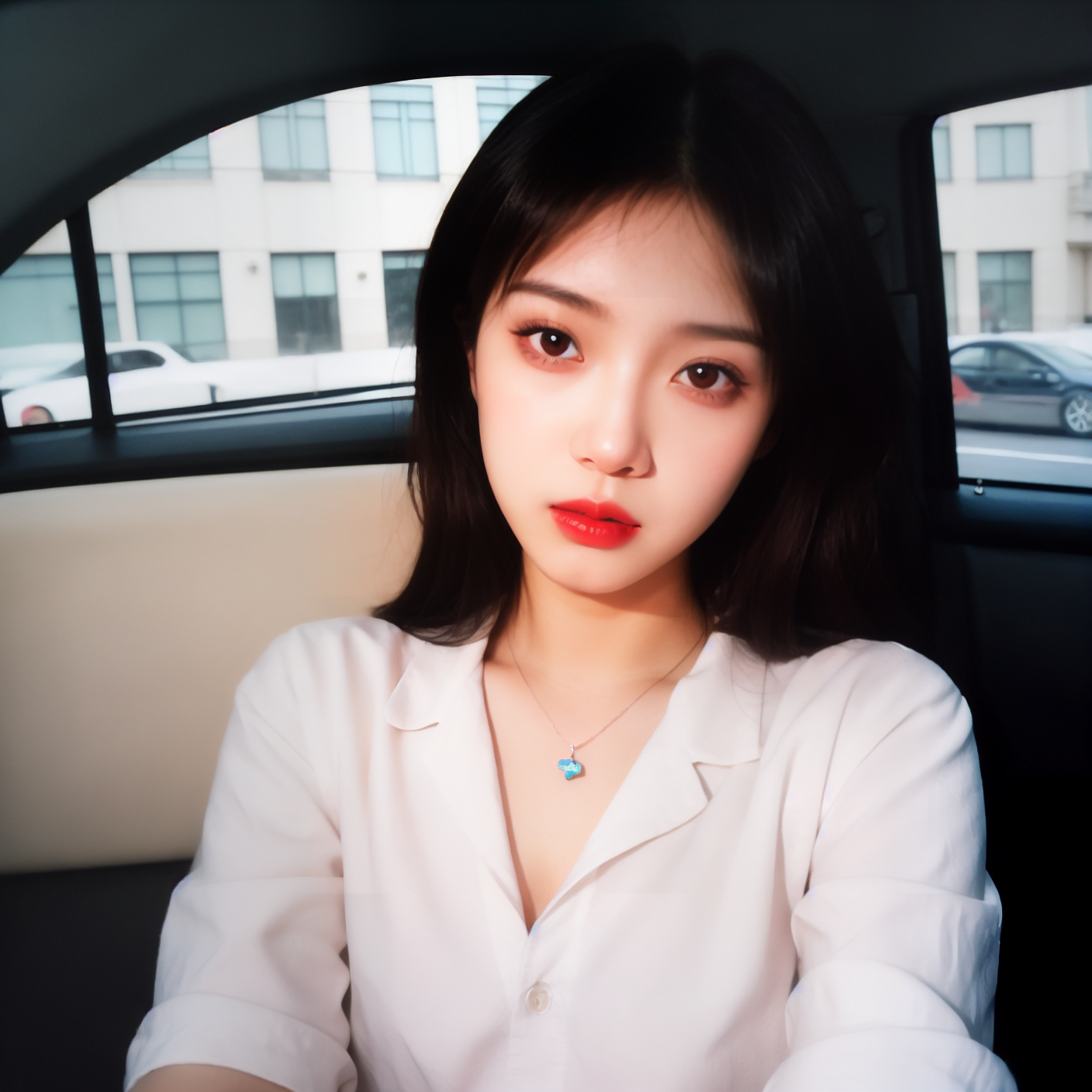 Photographed in A1.artultra high definition, film grain, real photos, 22-year-old girl, upper body, selfie in the car, straight hair, korean girl, inside the car, driving, lipstick, White casual shirt, necklace, sharp Eyeliner, blush, eyeshadow, thick eyelashes, daytime, sun shining on face, beautiful detailed eyes, extremely detailed eyes and face, extremely delicate beauty