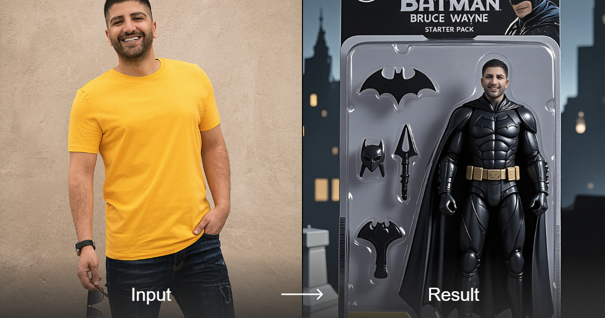Transform your photos into stunning digital artworks featuring a Batman action figure in vibrant, game character, animation, anime, Y2K aesthetics, and retro digital painting styles.