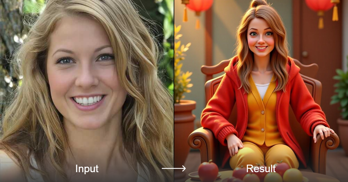 The My leisure time style converter creates stunning 3D images of people wearing vibrant red and yellow outfits, relaxing on a comfortable chair with a table of fruit in the foreground. The room is decorated with elegant red lanterns, creating a warm and inviting atmosphere.